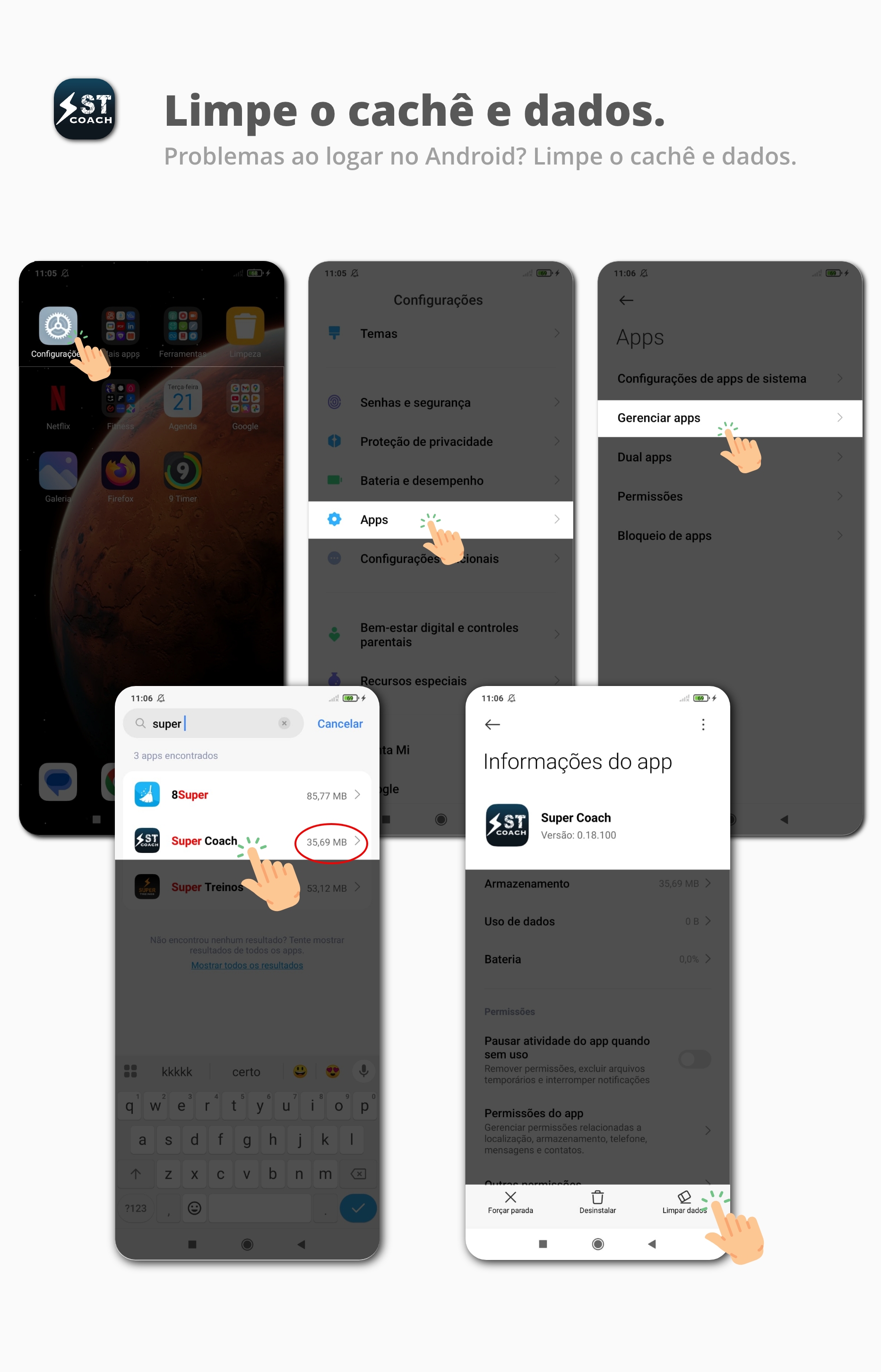 2️⃣ Clique em “Apps” > “Gerenciar Apps” > digite “Super Coach” e depois limpar Cache e dados.